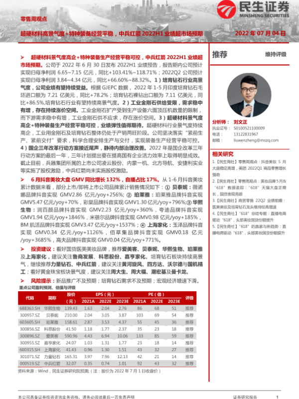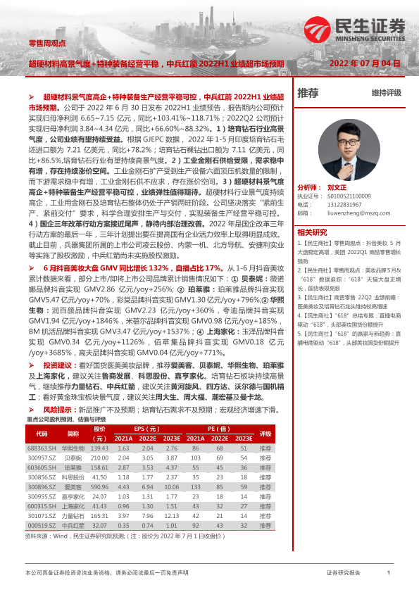 【民生证券】【20220704】零售周观点:超硬材料高景气度+特种装备经营平稳,中兵红箭2022H1业绩超市场预期-17页