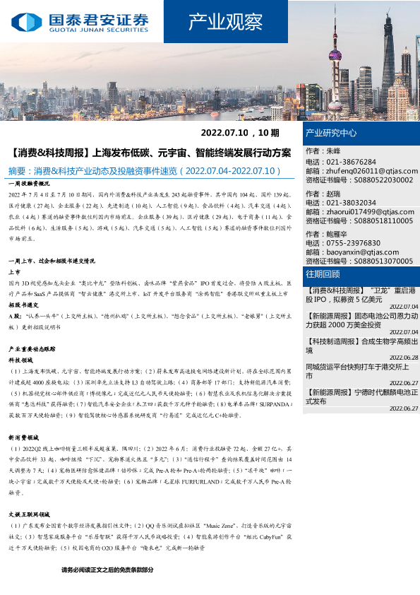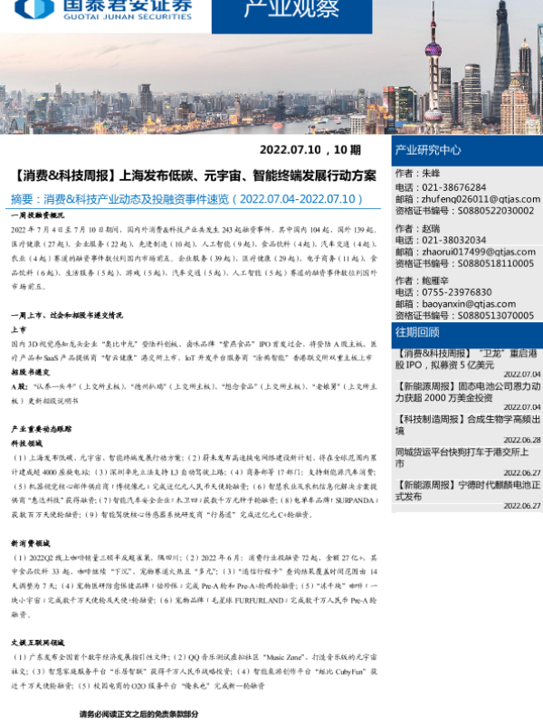 【国泰君安证券】【20220710】消费&科技周报:上海发布低碳、元宇宙、智能终端发展行动方案-15页