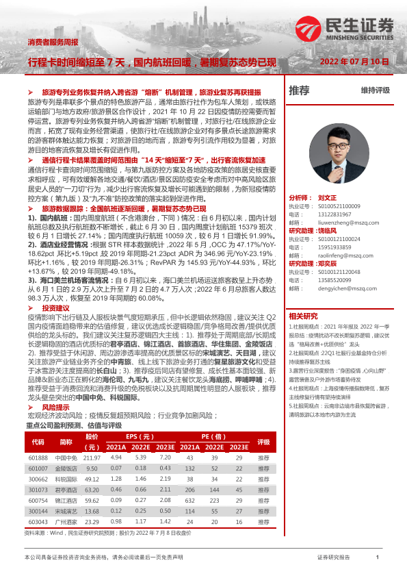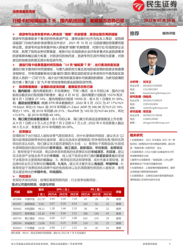 【民生证券】【20220710】消费者服务周报:行程卡时间缩短至7天,国内航班回暖,暑期复苏态势已现-23页