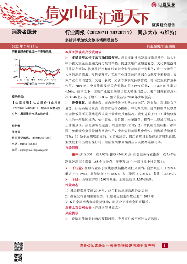 【山西证券】【20220717】消费者服务行业周报:多措并举加快文旅市场回暖复苏-9页