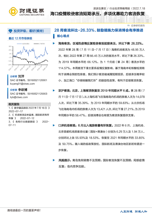 优惠政策 客流恢复 旅游及景区 海口疫情 证券分析