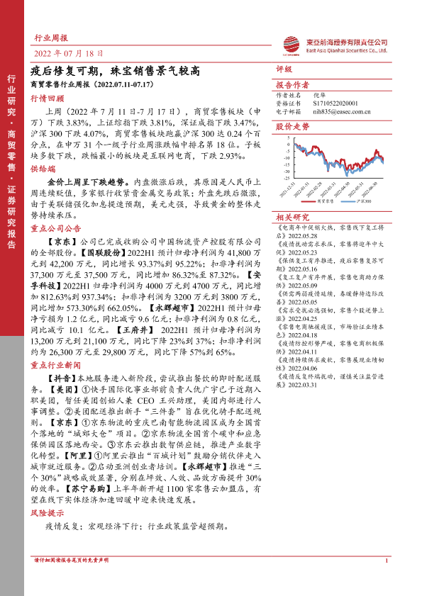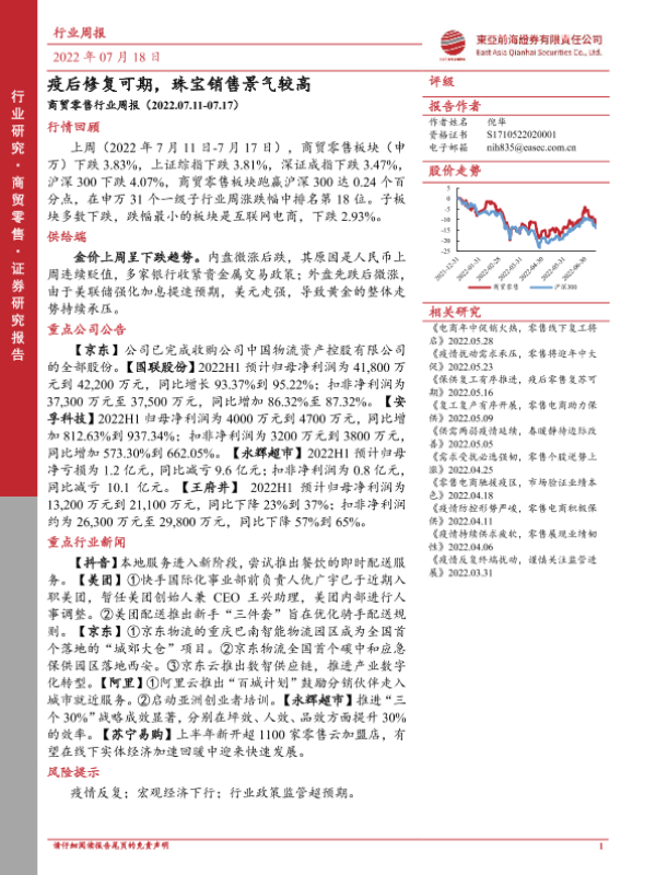 【东亚前海证券】【20220718】商贸零售行业周报:疫后修复可期,珠宝销售景气较高-18页