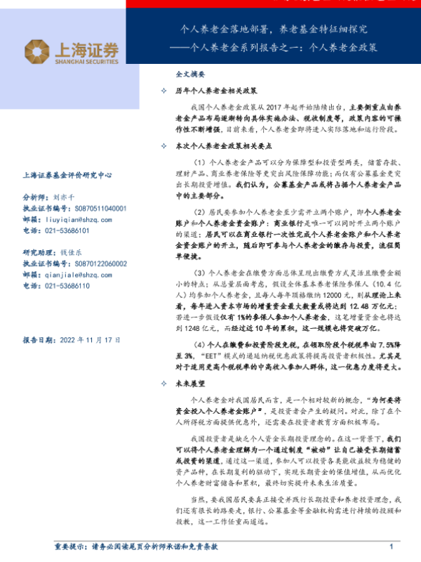 【上海证券】【20221117】个人养老金系列报告之一:个人养老金政策,个人养老金落地部署,养老基金特征细探究-17页