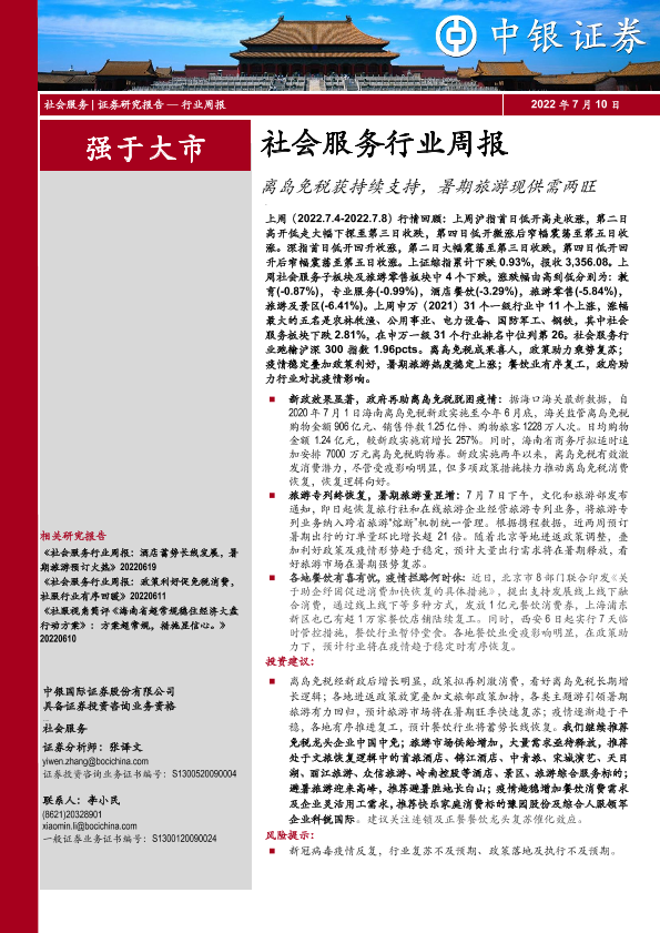 【中银证券】【20220710】社会服务行业周报:离岛免税获持续支持,暑期旅游现供需两旺-30页