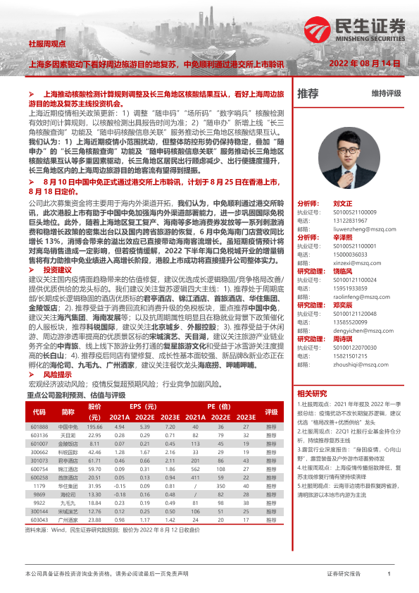 【民生证券】【20220814】社服周观点:上海多因素驱动下看好周边旅游目的地复苏,中免顺利通过港交所上市聆讯-24页