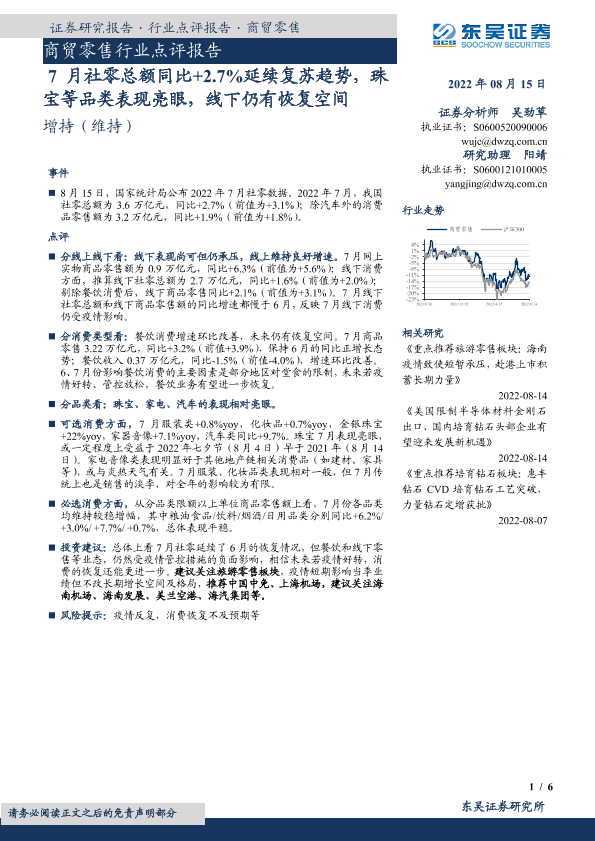 【东吴证券】【20220815】7月社零总额同比+2.7%延续复苏趋势,珠宝等品类表现亮眼,线下仍有恢复空间-6页