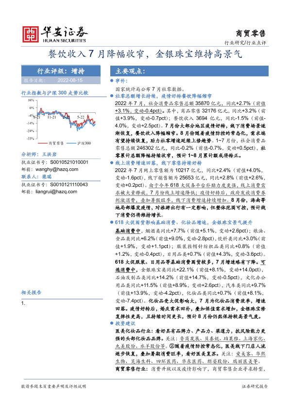 【华安证券】【20220815】商贸零售行业点评:餐饮收入7月降幅收窄,金银珠宝维持高景气-3页