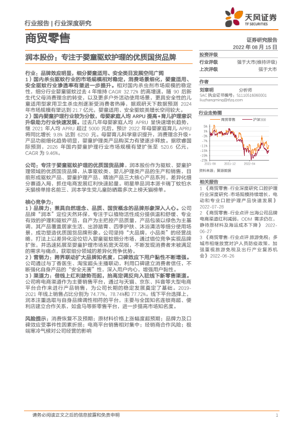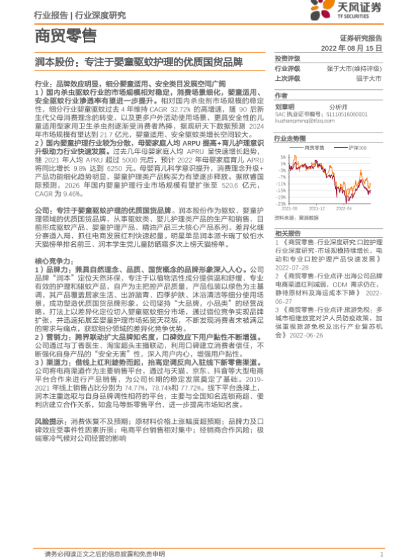 【天风证券】【20220815】商贸零售行业深度研究:润本股份:专注于婴童驱蚊护理的优质国货品牌-29页