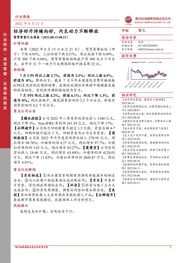 【东亚前海证券】【20220821】商贸零售行业周报:经济回升持续向好,内生动力不断释放-16页