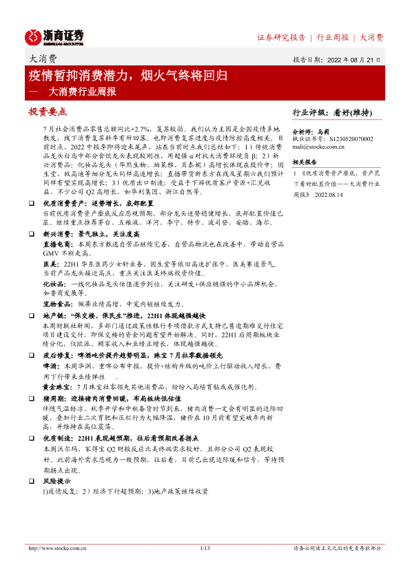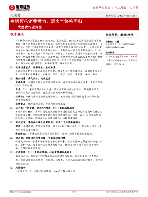 【浙商证券】【20220821】大消费行业周报:疫情暂抑消费潜力,烟火气终将回归-13页
