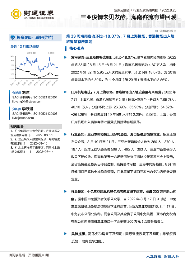 【财通证券】【20220823】旅游及景区行业投资策略周报:三亚疫情未见发酵,海南客流有望回暖-13页