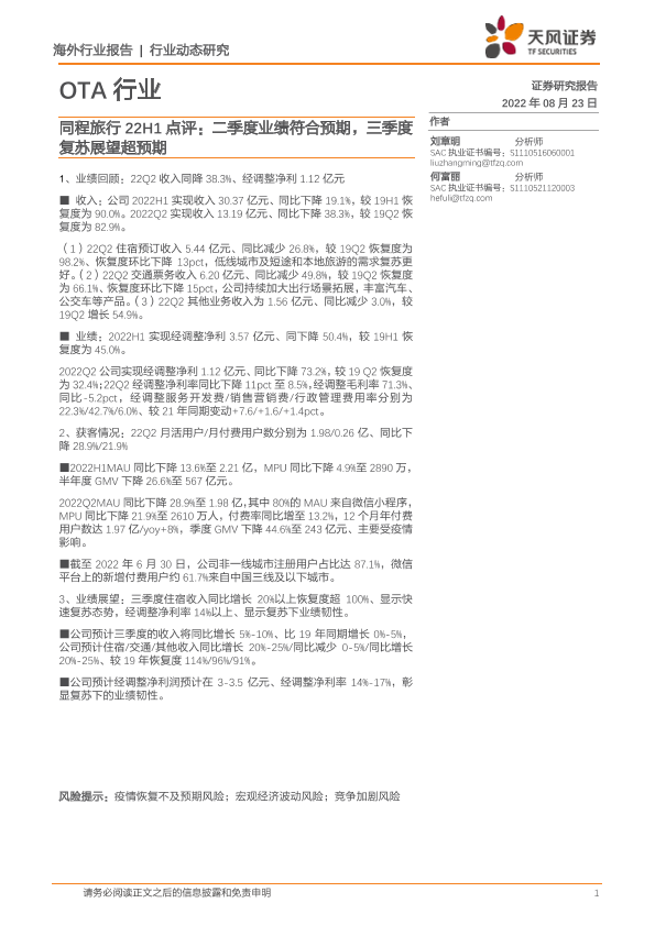 【天风证券】【20220823】同程旅行22H1点评:二季度业绩符合预期,三季度复苏展望超预期-2页