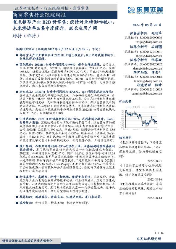 【东吴证券】【20220829】商贸零售行业跟踪周报:重点推荐产业B2B新零售-14页