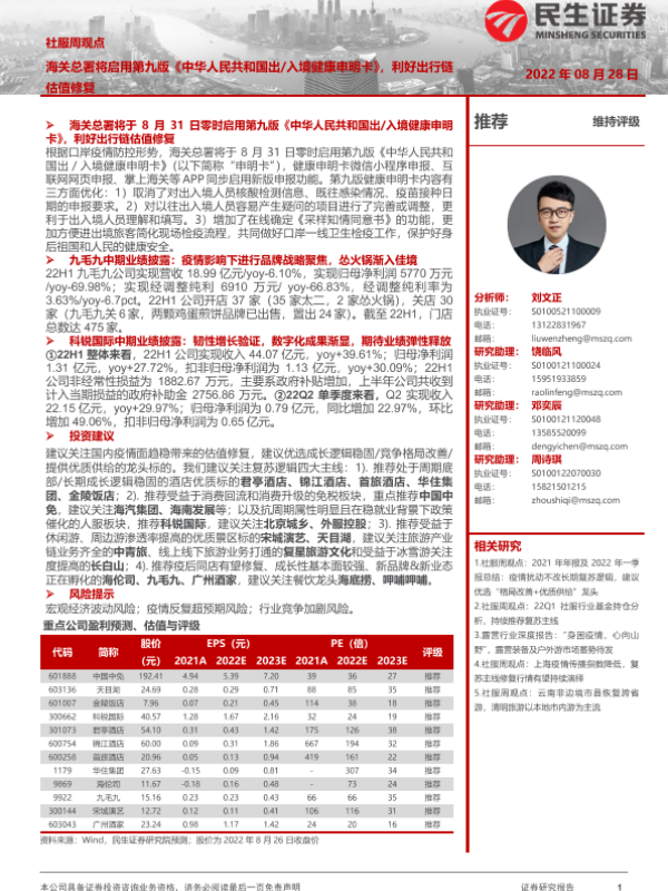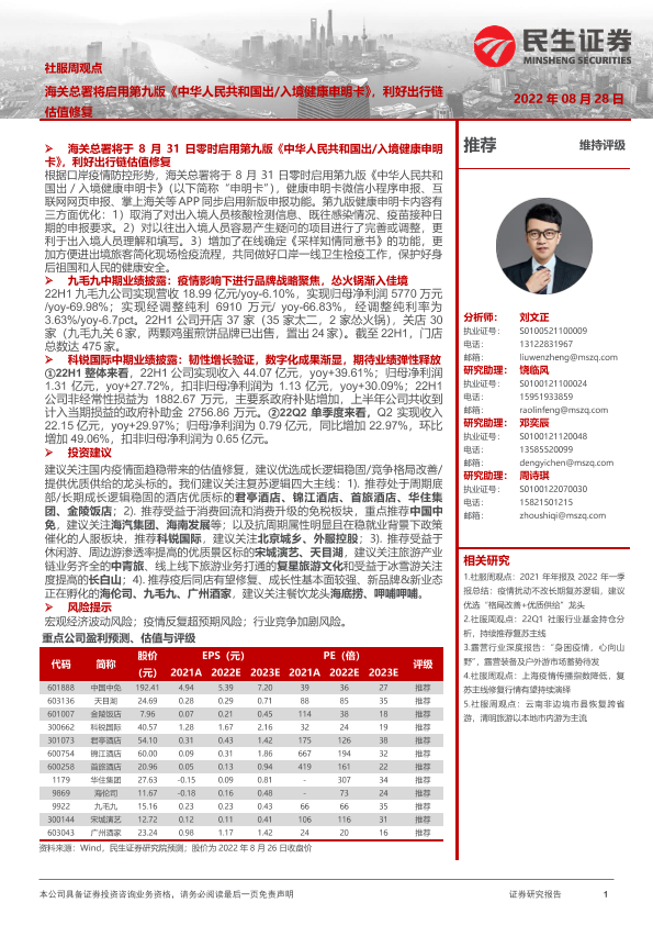【民生证券】【20220828】社服周观点:海关总署将启用第九版《中华人民共和国出入境健康申明卡》,利好出行链估值修复-27页