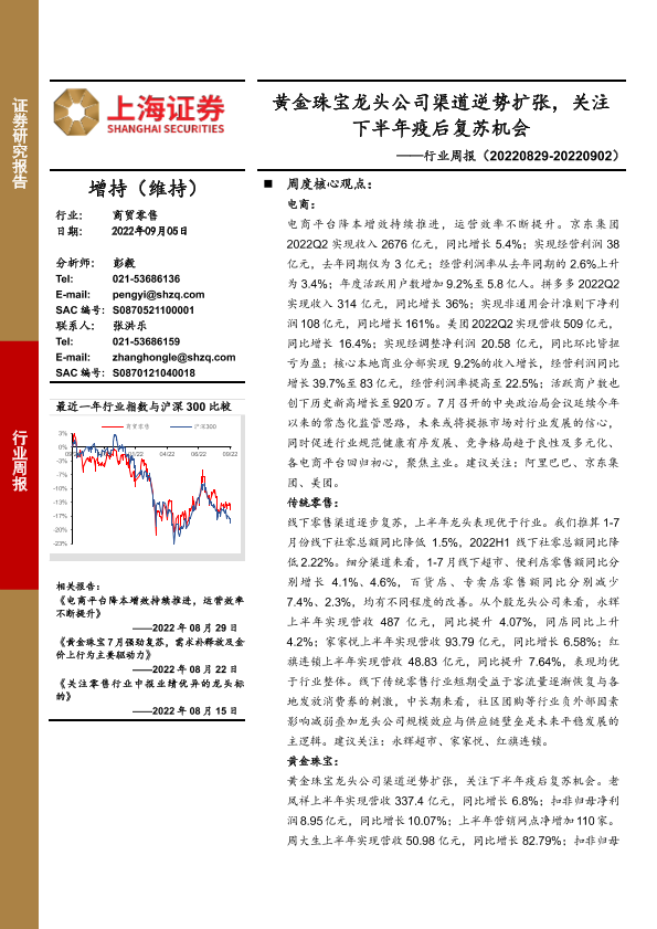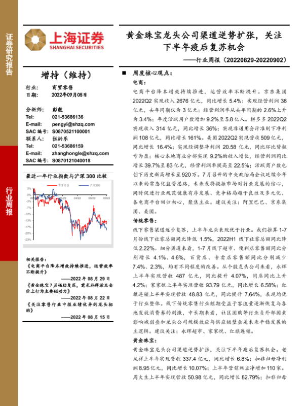 【上海证券】【20220905】商贸零售行业周报:黄金珠宝龙头公司渠道逆势扩张,关注下半年疫后复苏机会-11页