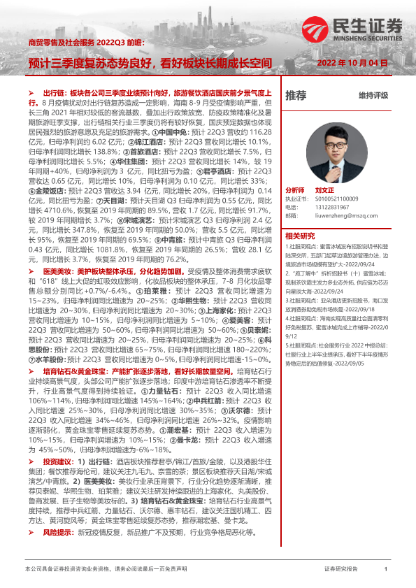 【民生证券】【20221004】商贸零售及社会服务2022Q3前瞻:预计三季度复苏态势良好,看好板块长期成长空间-20页