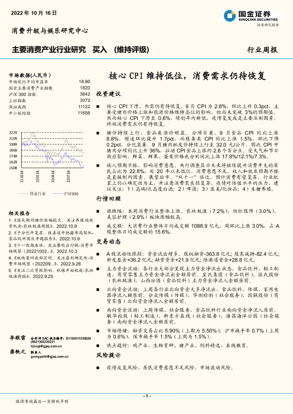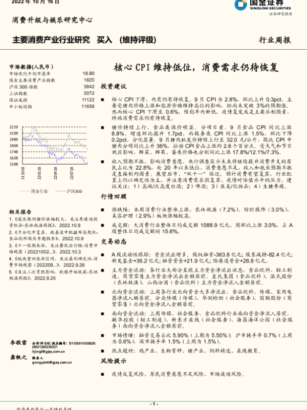 【国金证券】【20221016】主要消费产业行业周报:核心CPI维持低位,消费需求仍待恢复-18页