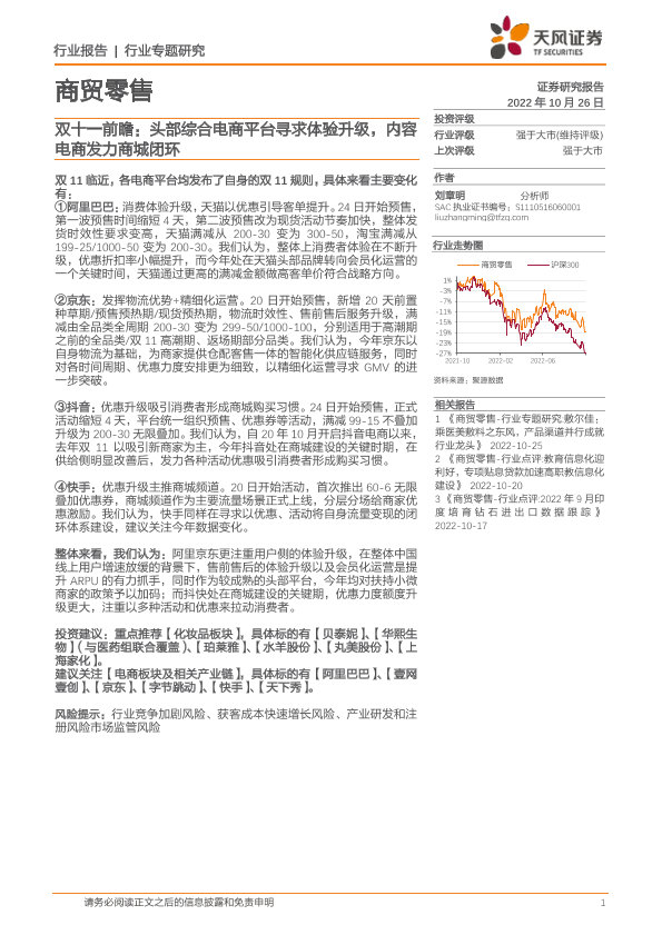 【天风证券】【20221026】商贸零售双十一前瞻:头部综合电商平台寻求体验升级,内容电商发力商城闭环-23页