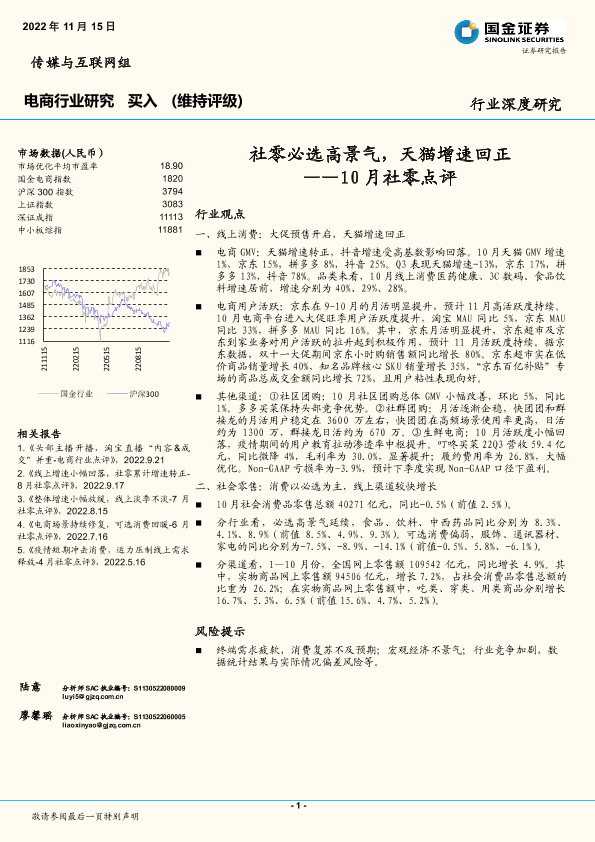 【国金证券】【20221115】10月社零点评-社零必选高景气,天猫增速回正-16页