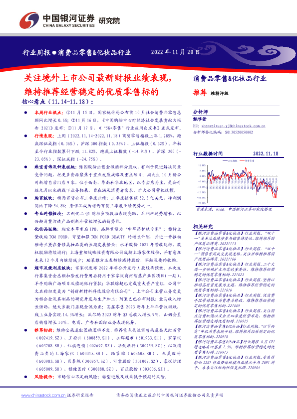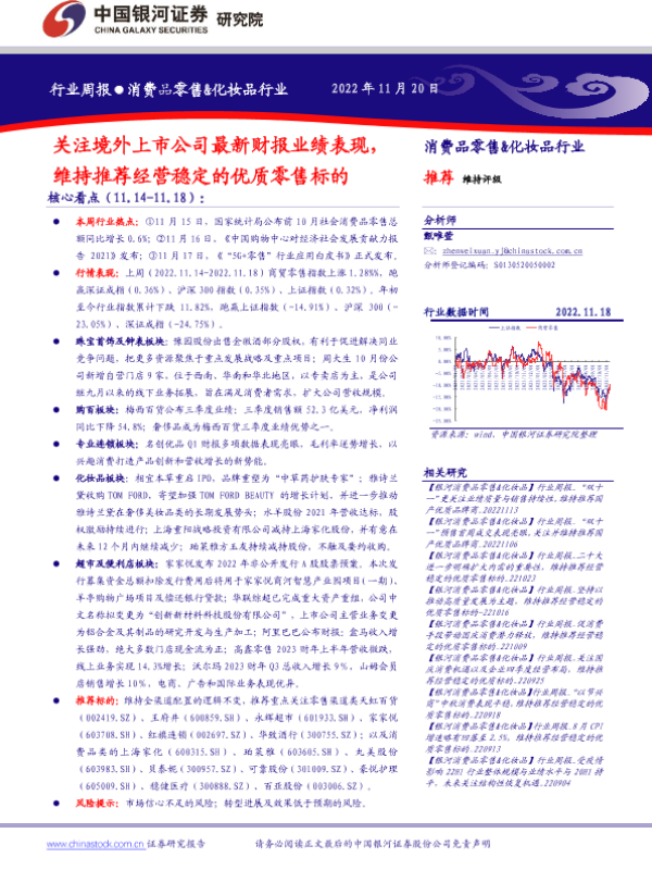 【银河证券】【20221120】消费品零售&化妆品行业周报:关注境外上市公司最新财报业绩表现,维持推荐经营稳定的优质零售标的-32页