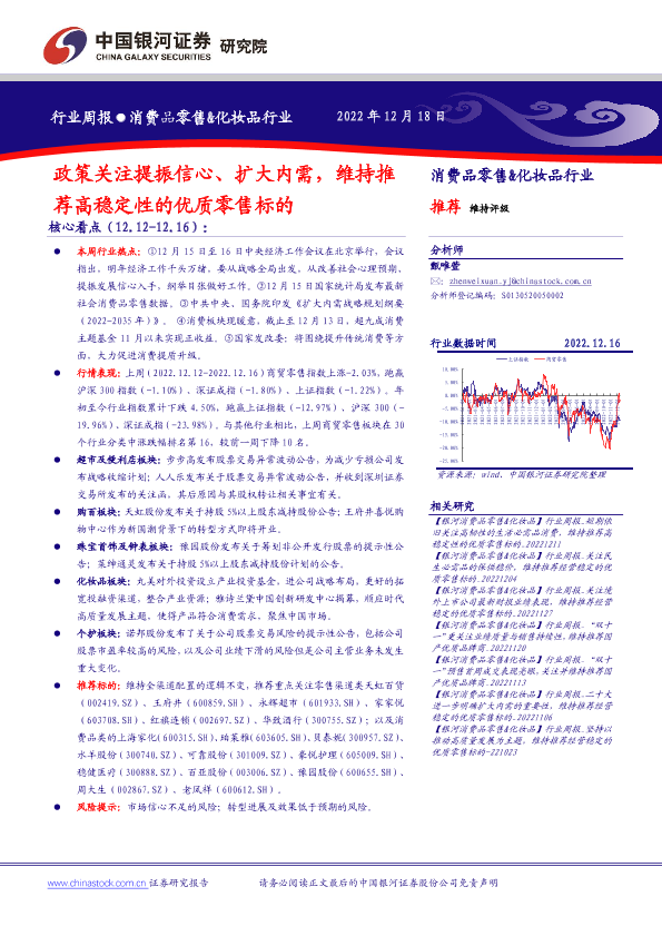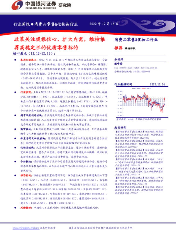 【银河证券】【20221218】消费品零售&化妆品行业周报:政策关注提振信心、扩大内需,维持推荐高稳定性的优质零售标的-30页