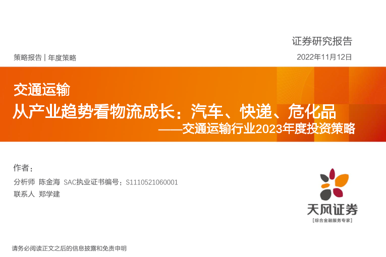 【天风证券】【20221112】交通运输行业2023年度投资策略:从产业趋势看物流成长,汽车、快递、危化品-56页