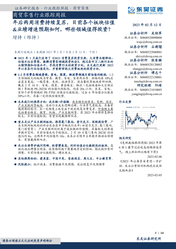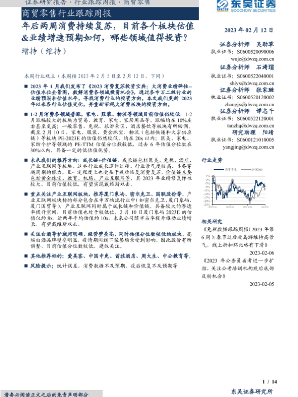【东吴证券】【20230212】商贸零售行业跟踪周报:年后两周消费持续复苏,目前各个板块估值&业绩增速预期如何,哪些领域值得投资?-14页