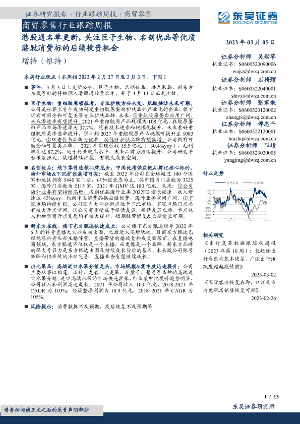 【东吴证券】【20230305】商贸零售行业跟踪周报:港股通名单更新,关注巨子生物、名创优品等优质港股消费标的后续投资机会-13页