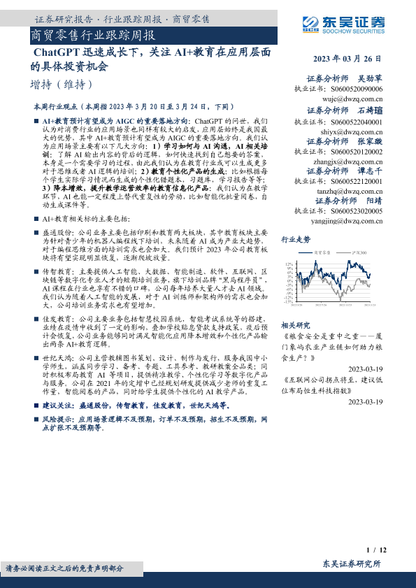 【东吴证券】【20230326】商贸零售行业跟踪周报:ChatGPT迅速成长下,关注AI+教育在应用层面的具体投资机会-12页