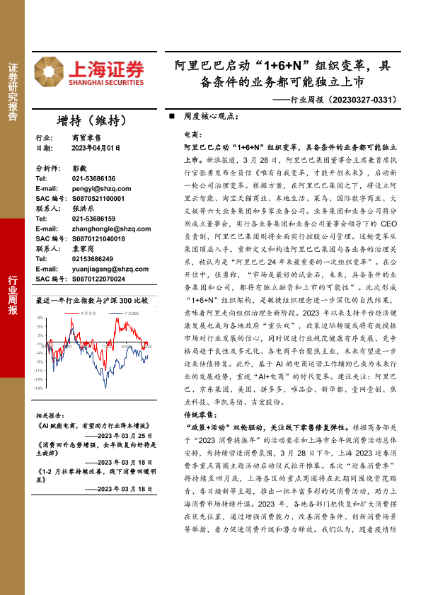 【上海证券】【20230401】商贸零售行业周报:阿里巴巴启动“1+6+N”组织变革,具备条件的业务都可能独立上市-12页