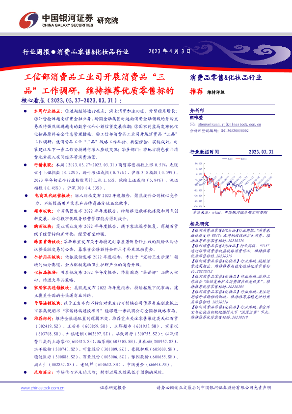 【银河证券】【20230331】消费品零售&化妆品行业周报:工信部消费品工业司开展消费品“三品”工作调研,维持推荐优质零售标的-33页