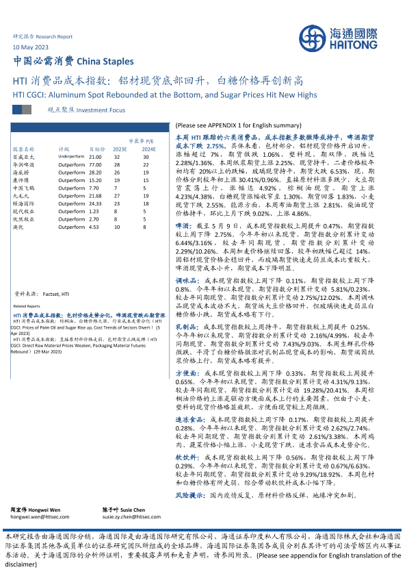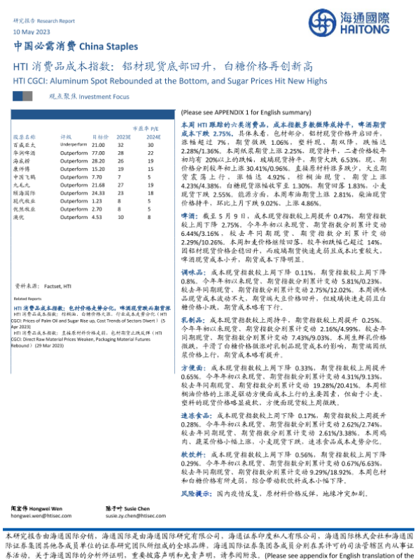 【海通国际】【20230510】HTI消费品成本指数:铝材现货底部回升,白糖价格再创新高-17页