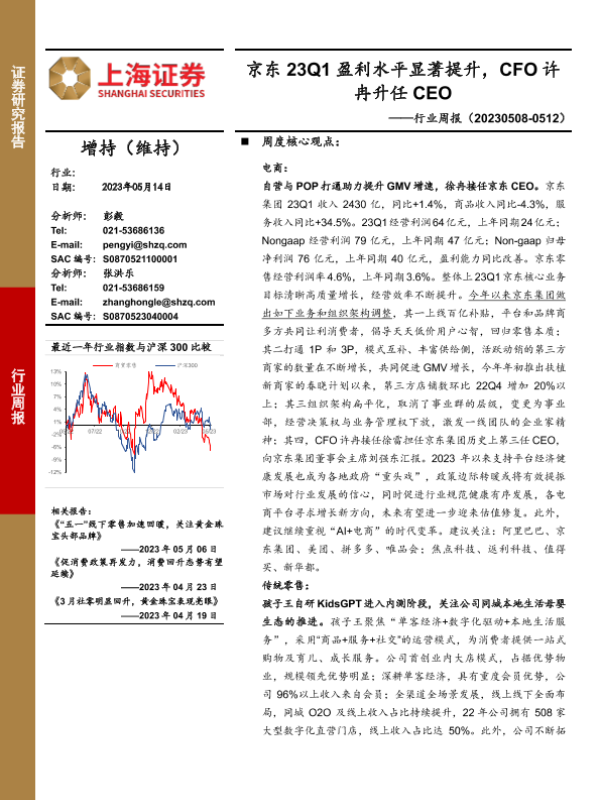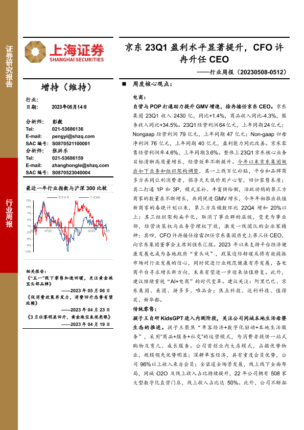【上海证券】【20230514】商贸零售行业周报:京东23Q1盈利水平显著提升,CFO许冉升任CEO-14页