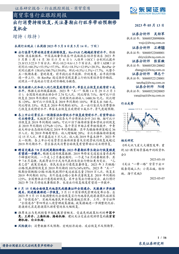 【东吴证券】【20230513】商贸零售行业跟踪周报:出行消费持续恢复,关注暑期出行旺季带动预期修复机会-16页