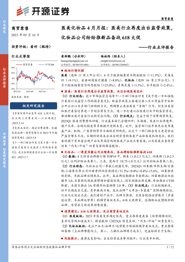 【开源证券】【20230516】医美化妆品4月月报:医美行业再度出台监管政策,化妆品公司纷纷推新品备战618大促-12页