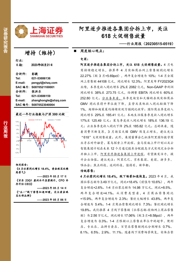 【上海证券】【20230521】商贸零售行业周报:阿里逐步推进各集团分拆上市,关注618大促销售放量-14页