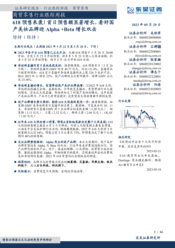 【东吴证券】【20230529】618预售来袭!首日预售额显著增长,看好国产美妆品牌迎Alpha+Beta增长双击-14页