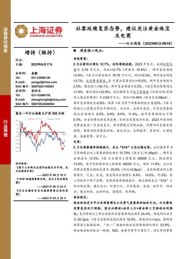 【上海证券】【20230617】商贸零售行业周报:社零延续复苏态势,建议关注黄金珠宝及电商-12页