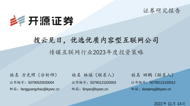 【开源证券】【20221114】传媒互联网行业2023年度投资策略:拨云见日,优选优质内容型互联网公司-45页
