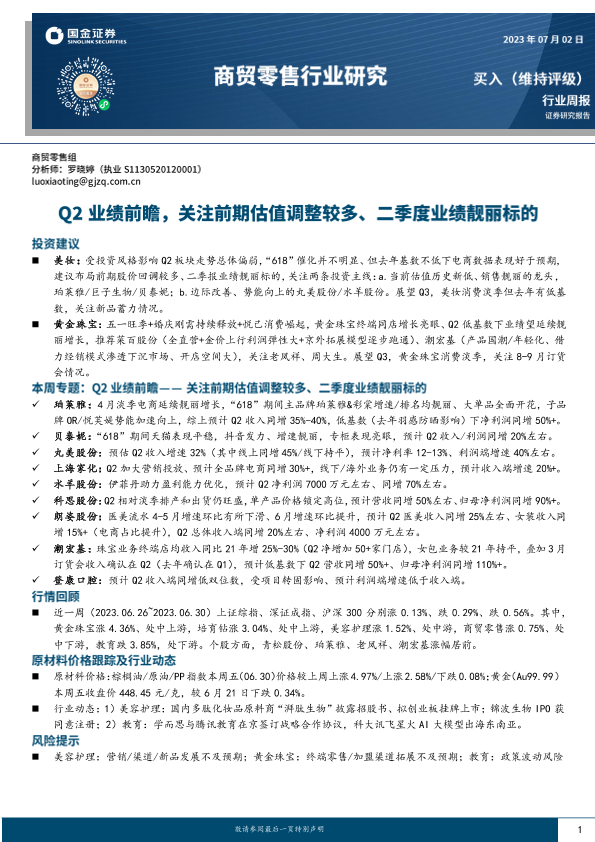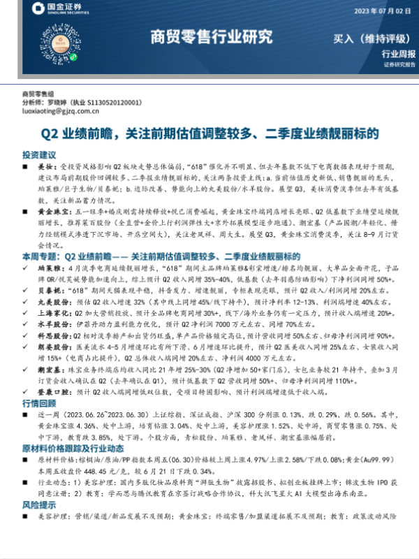 业绩前瞻 商贸零售 投资建议 美妆 黄金珠宝