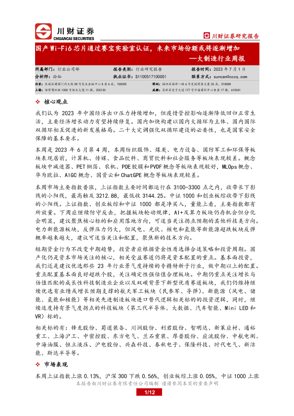 【川财证券】【20230701】大制造行业周报:国产Wi-Fi6芯片通过赛宝实验室认证,未来市场份额或将逐渐增加-12页