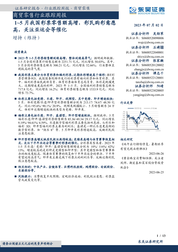 【东吴证券】【20230702】1~5月我国彩票零售额高增,彩民购彩意愿高,关注亚运会等催化-13页