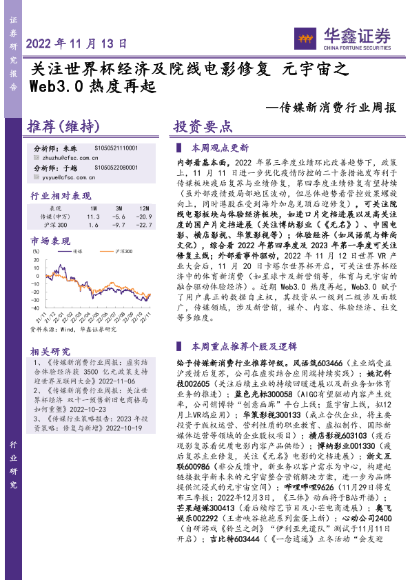【华鑫证券】【20221113】传媒新消费行业周报:关注世界杯经济及院线电影修复 元宇宙之Web30热度再起-20页