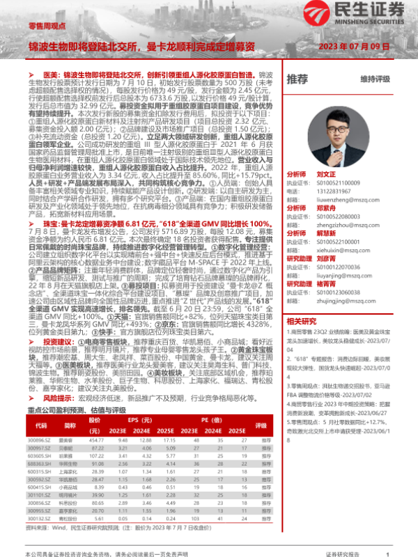 【民生证券】【20230709】零售周观点:锦波生物即将登陆北交所,曼卡龙顺利完成定增募资-19页