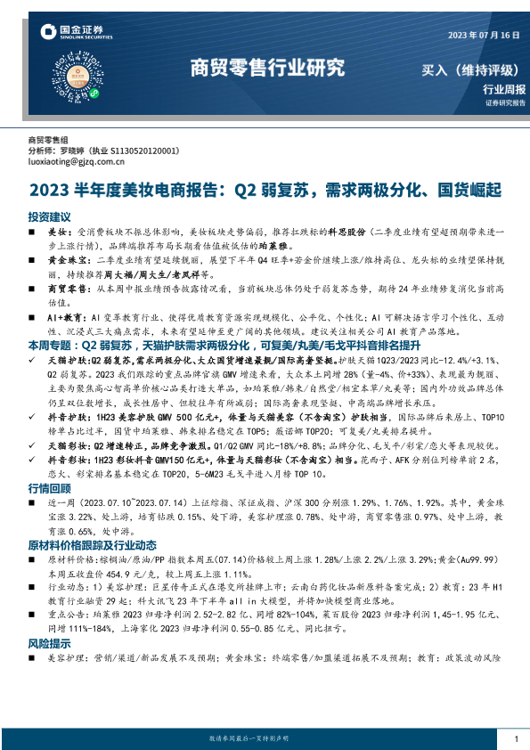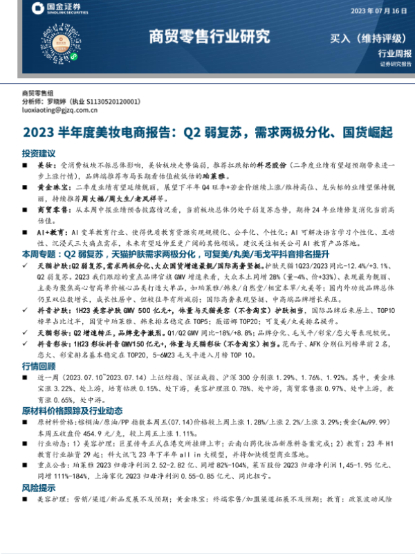 【国金证券】【20230716】2023半年度美妆电商报告:Q2弱复苏,需求两极分化、国货崛起-23页