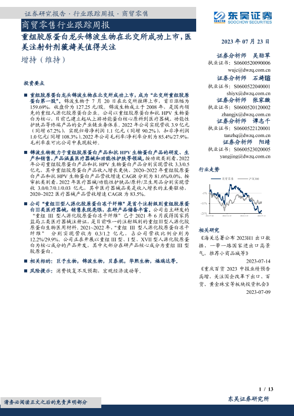 【东吴证券】【20230723】商贸零售行业跟踪周报:重组胶原蛋白龙头锦波生物在北交所成功上市,医美注射针剂薇旖美值得关注-13页
