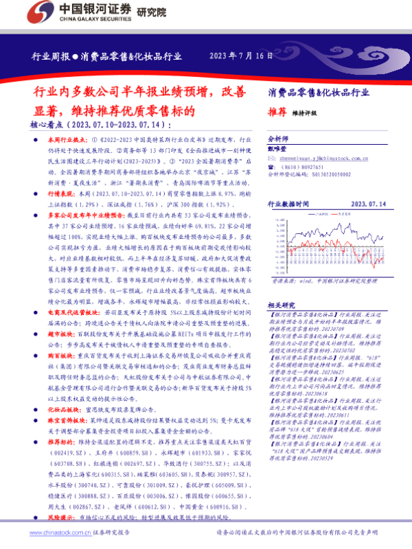 【银河证券】【20230716】消费品零售&化妆品行业周报:行业内多数公司半年报业绩预增,改善显著,维持推荐优质零售标的-35页