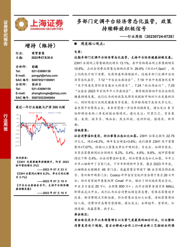 【上海证券】【20230730】商贸零售行业周报:多部门定调平台经济常态化监管,政策持续释放积极信号-17页