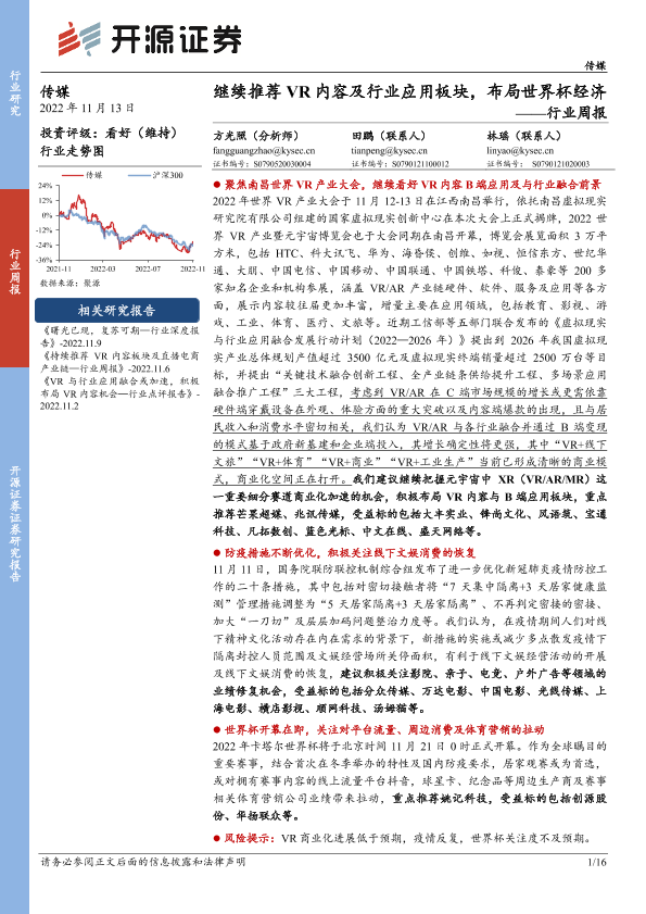 【开源证券】【20221113】传媒行业周报:继续推荐VR内容及行业应用板块,布局世界杯经济-16页