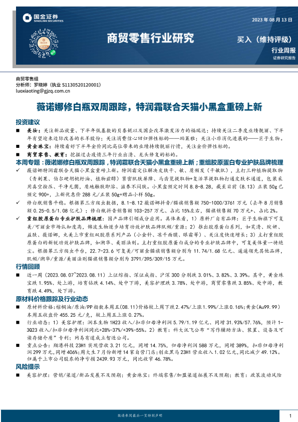 【国金证券】【20230813】商贸零售行业研究:薇诺娜修白瓶双周跟踪,特润霜联合天猫小黑盒重磅上新-20页